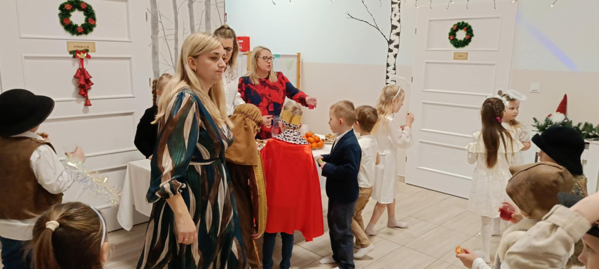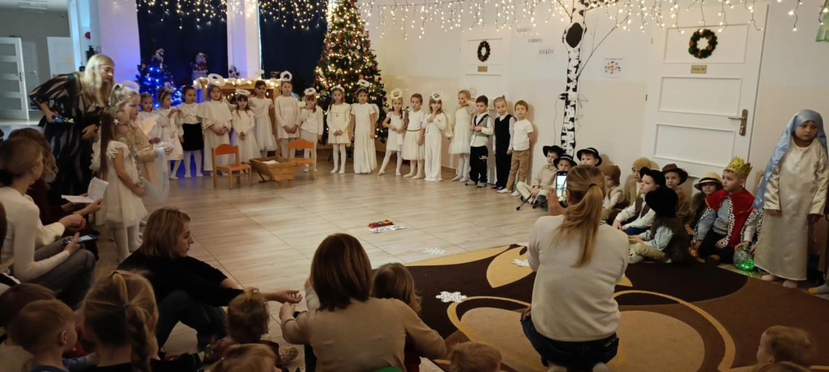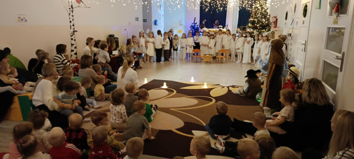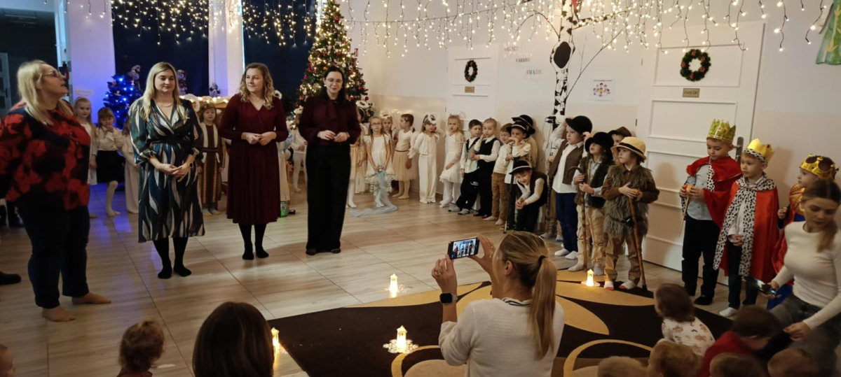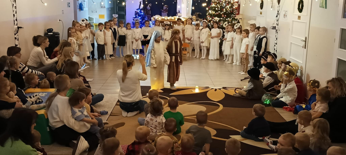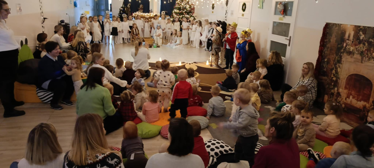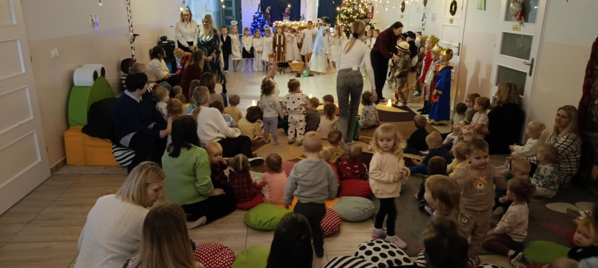 We wtorek 16 grudnia 2025 roku w naszym żłobku zapanowała bardzo świąteczna atmosfera. Odwiedziły nas dzieci z grupy „Jaskółki” i „Bociany” z Przedszkola nr 2 w Sokółce i przedstawiły Jasełka. Świąteczny nastrój podkreślały niecodzienne stroje przybyłych gości, a także bożonarodzeniowa dekoracja żłobka. Młodzi aktorzy w przystępny sposób przybliżyli nam sceny związane z narodzeniem Jezusa. Podziwialiśmy występy pięknie ubranych aniołków, świętej rodziny, pastuszków i króli. Z dużą uwagą słuchaliśmy przepięknych kolęd i pastorałek w wykonaniu przedszkolaków. Mali widzowie oklaskiwali każdą kolędę i występ młodych aktorów, tak im się podobało. Na zakończenie były świąteczne i noworoczne życzenia, a później słodki poczęstunek dla młodych artystów.