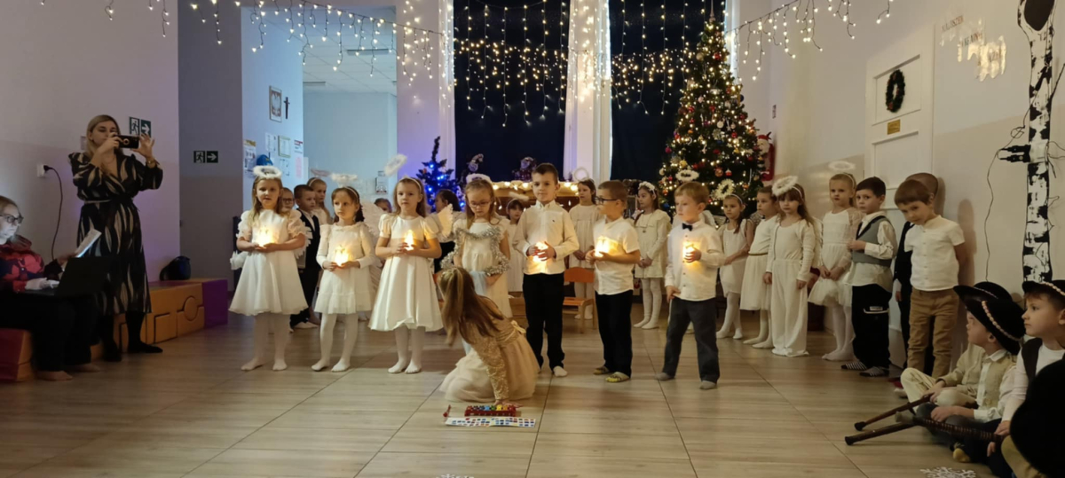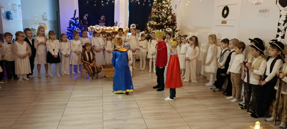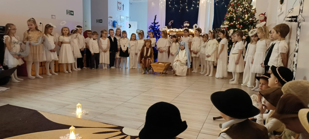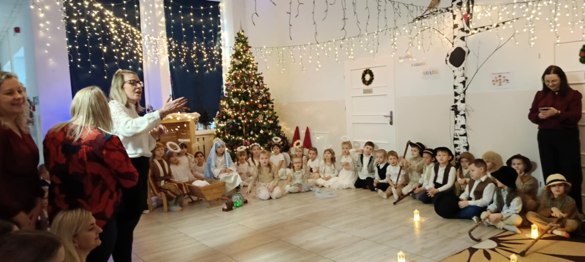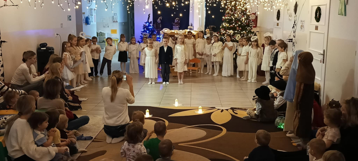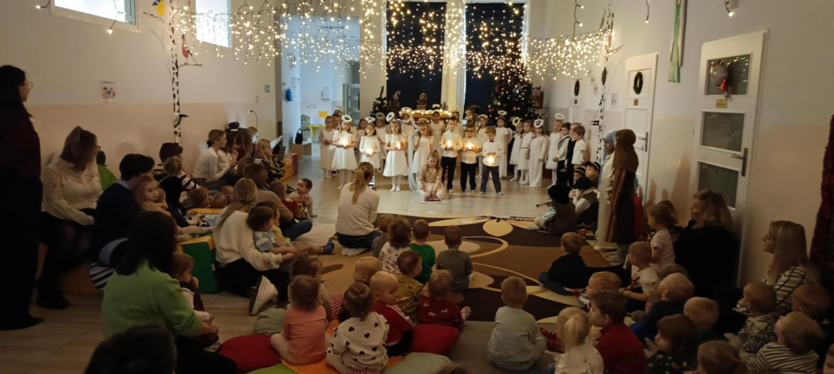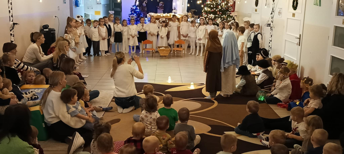 We wtorek 16 grudnia 2025 roku w naszym żłobku zapanowała bardzo świąteczna atmosfera. Odwiedziły nas dzieci z grupy „Jaskółki” i „Bociany” z Przedszkola nr 2 w Sokółce i przedstawiły Jasełka. Świąteczny nastrój podkreślały niecodzienne stroje przybyłych gości, a także bożonarodzeniowa dekoracja żłobka. Młodzi aktorzy w przystępny sposób przybliżyli nam sceny związane z narodzeniem Jezusa. Podziwialiśmy występy pięknie ubranych aniołków, świętej rodziny, pastuszków i króli. Z dużą uwagą słuchaliśmy przepięknych kolęd i pastorałek w wykonaniu przedszkolaków. Mali widzowie oklaskiwali każdą kolędę i występ młodych aktorów, tak im się podobało. Na zakończenie były świąteczne i noworoczne życzenia, a później słodki poczęstunek dla młodych artystów.