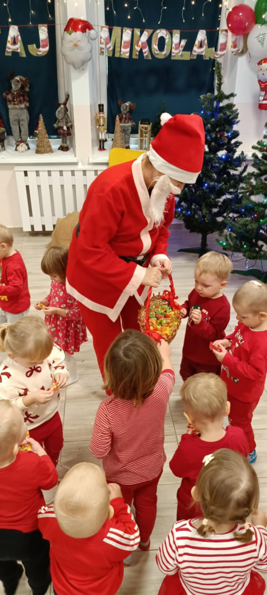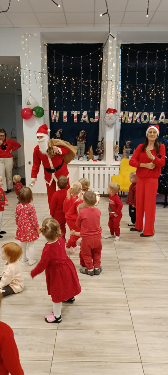 Podczas zabawy usłyszeliśmy dzwoneczki: „Czy to Mikołaj?”. Zawołaliśmy go głośno i chyba usłyszał, bo przybył z workami pełnymi prezentów. Przywitał się z nami bardzo miło i zaprosił do wspólnej zabawy przy skocznych piosenkach. Po wesołej zabawie Mikołaj obdarował dzieci pysznymi cukierkami i pozował do pamiątkowych zdjęć. Na zakończenie uroczystości odwiedził wszystkie maluszki w swoich salach, rozdał prezenty, pożegnał się z żalem i odjechał do innych dzieci, które w tym szczególnym dniu na niego czekały.