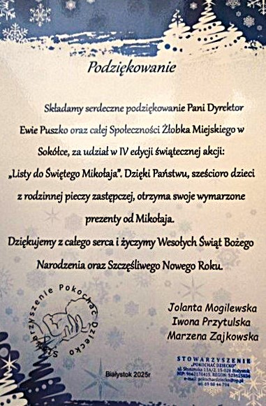 W tym roku Żłobek Miejski w Sokółce dołączył do świątecznej akcji: „Listy do Świętego Mikołaja”. W tej akcji każdy mógł zostać Świętym Mikołajem i spełnić marzenia jednego lub więcej dzieci z Rodzinnych Domów Dziecka i Rodzin Zastępczych z Białegostoku oraz sąsiednich powiatów, w tym z powiatu sokólskiego.