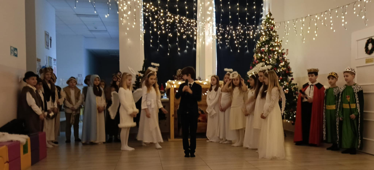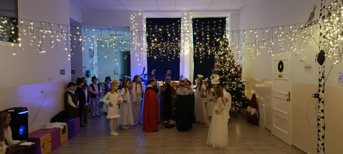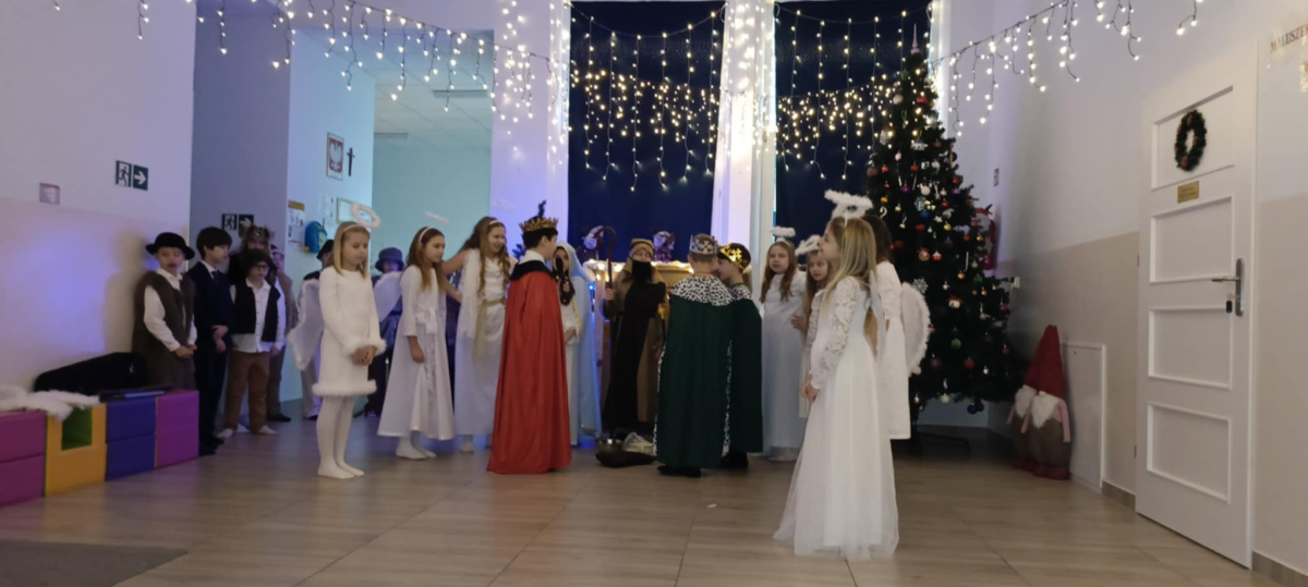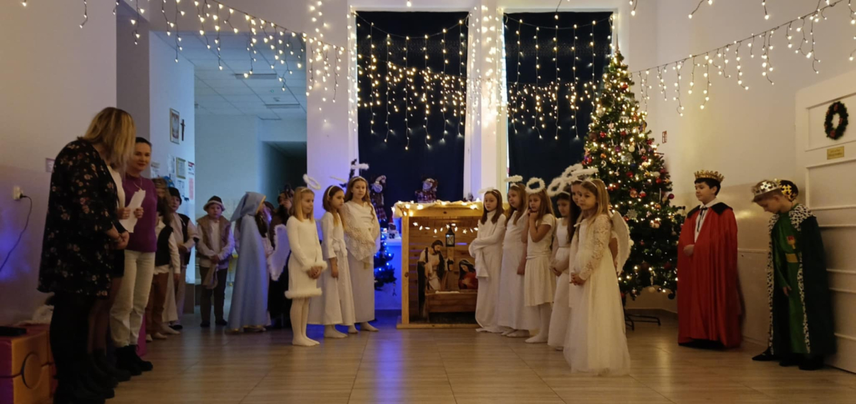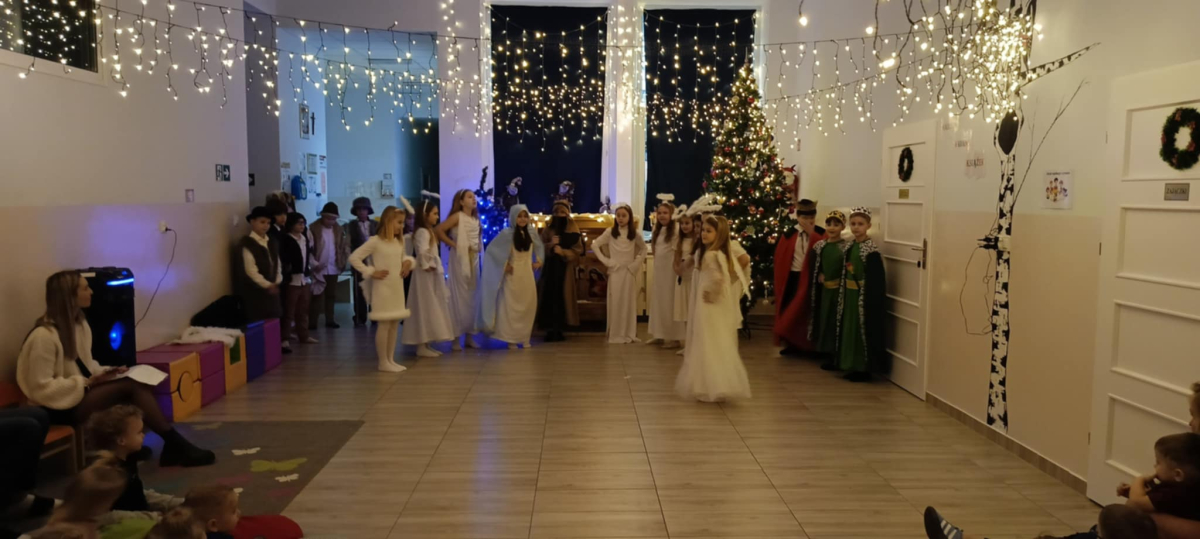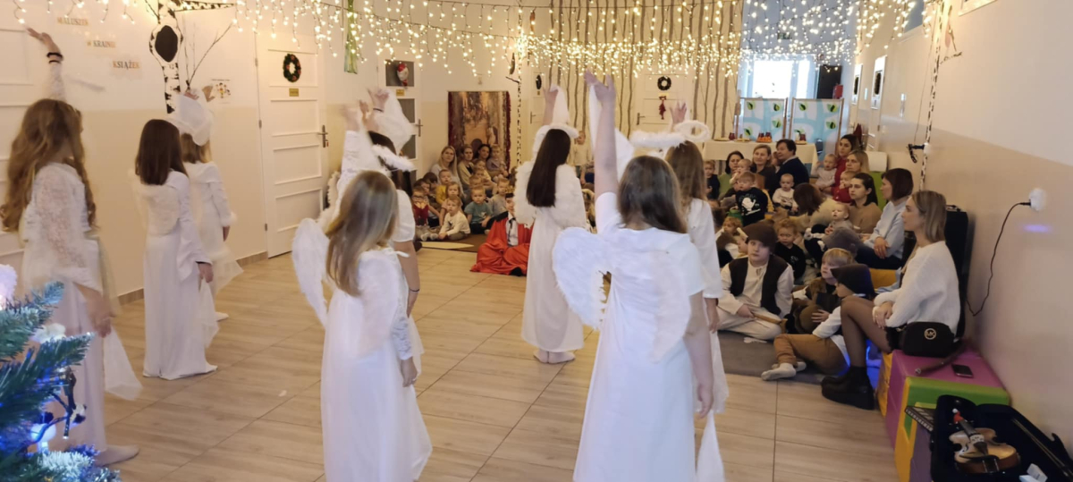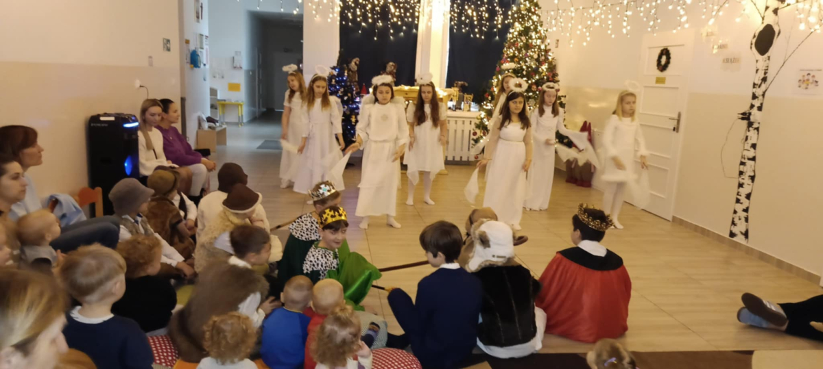 Uczniowie w strojach aniołków, świętej rodziny, pastuszków i króli w prosty sposób opowiedzieli historię narodzin Bożego Dzieciątka. Opowieści tej towarzyszyły piękne kolędy, skoczne pastorałki, a nawet anielskie dźwięki skrzypiec, ku wielkiemu zaskoczeniu maluszków. Podziwialiśmy również wspaniałe taneczne widowisko w wykonaniu aniołków.