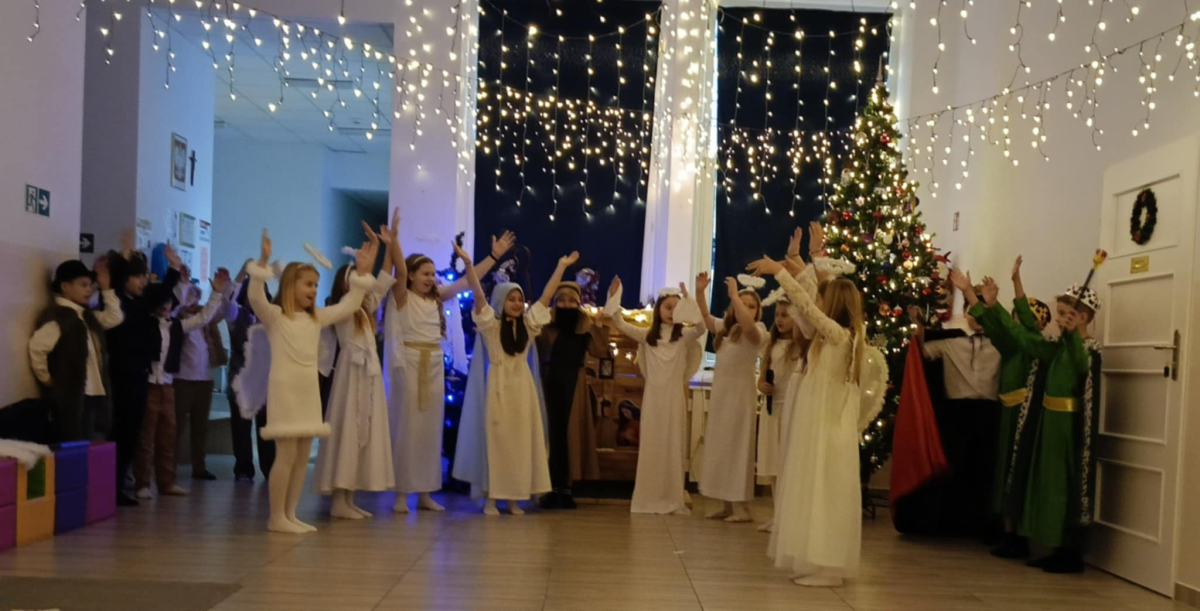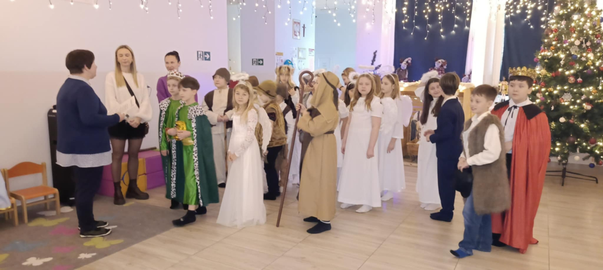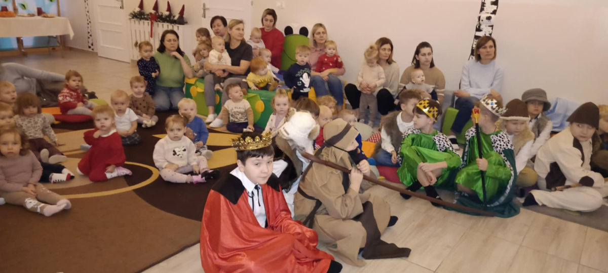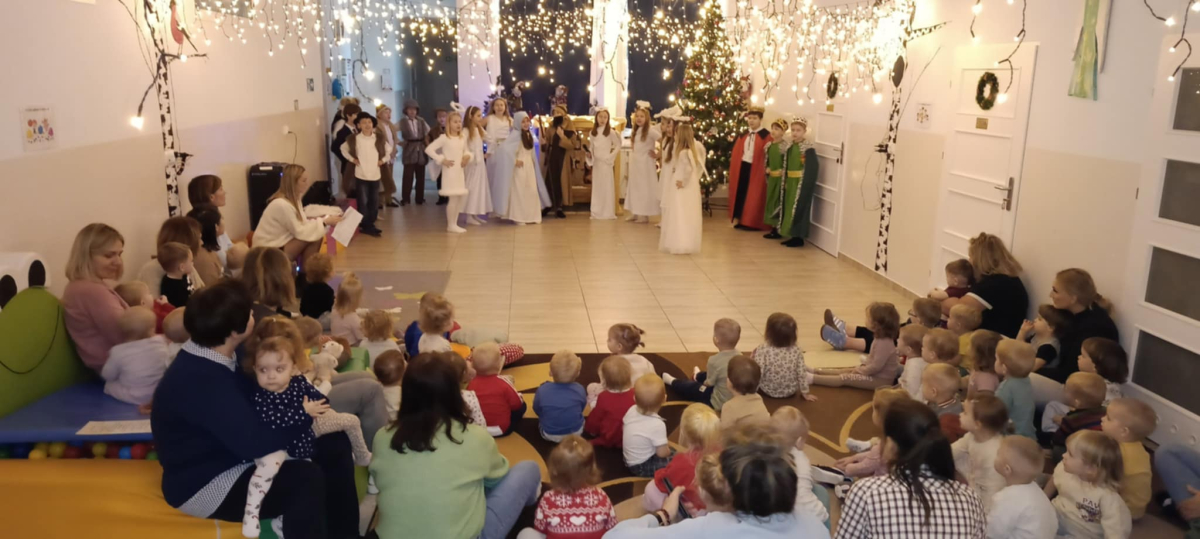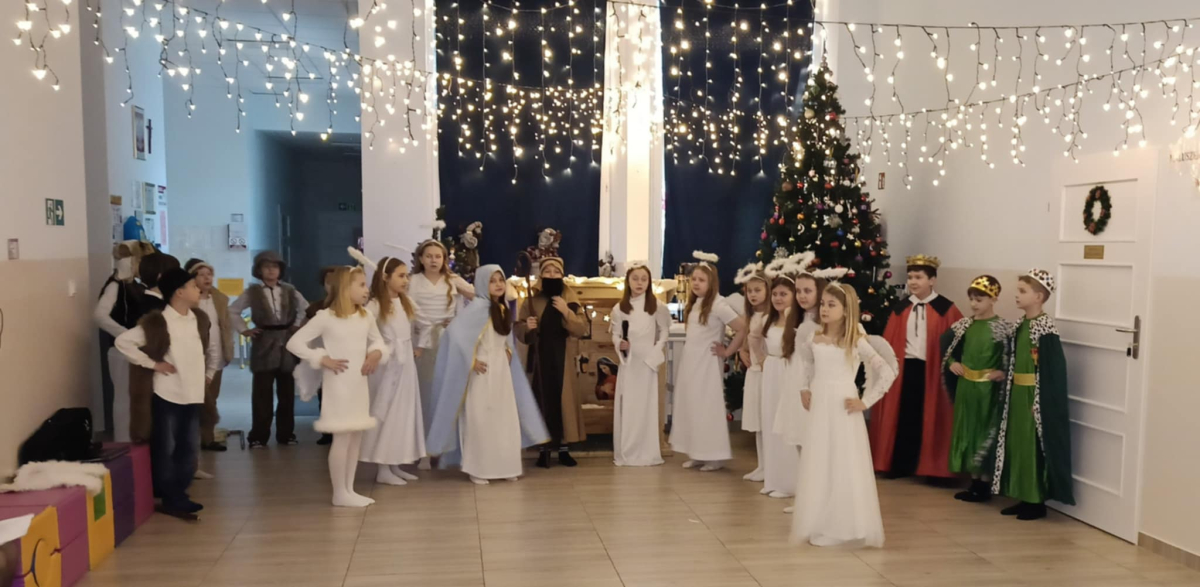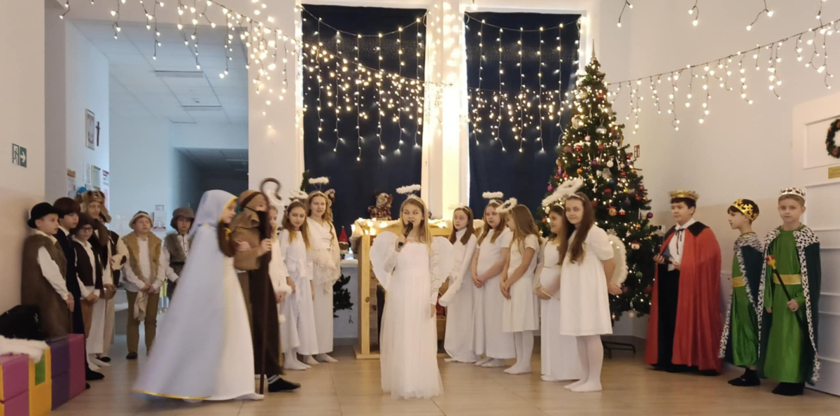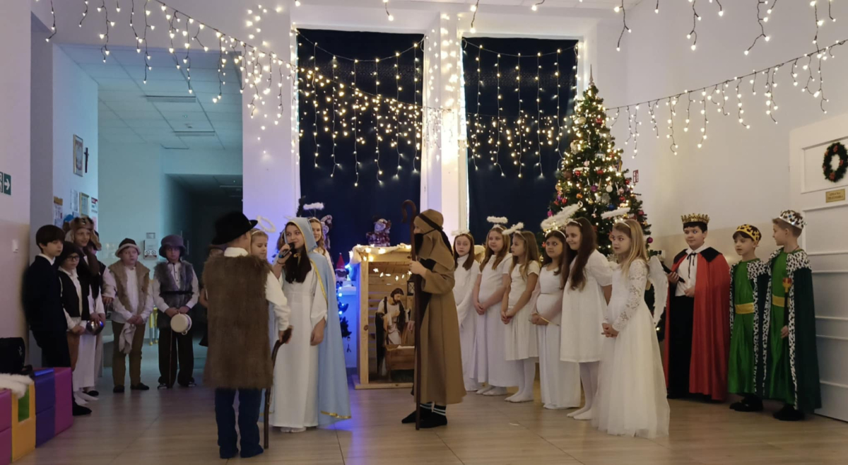 Uczniowie w strojach aniołków, świętej rodziny, pastuszków i króli w prosty sposób opowiedzieli historię narodzin Bożego Dzieciątka. Opowieści tej towarzyszyły piękne kolędy, skoczne pastorałki, a nawet anielskie dźwięki skrzypiec, ku wielkiemu zaskoczeniu maluszków. Podziwialiśmy również wspaniałe taneczne widowisko w wykonaniu aniołków.