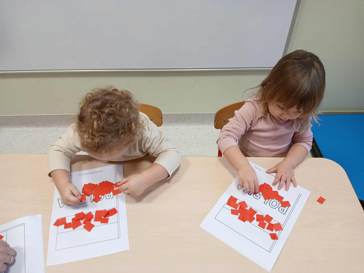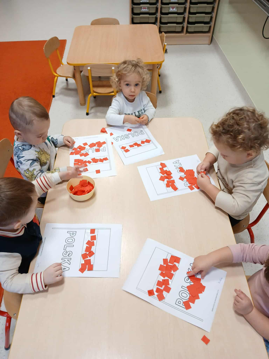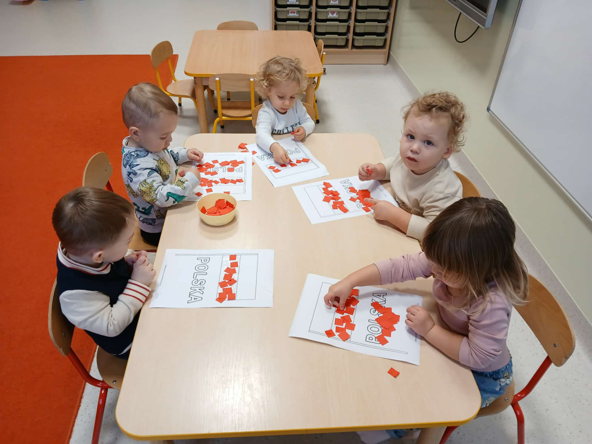 Z okazji Dnia Niepodległości dzieci przy pomocy opiekunek wykonały flagę Polski. Była to doskonała okazja do kształtowania postaw patriotycznych w przystępny dla maluchów sposób.